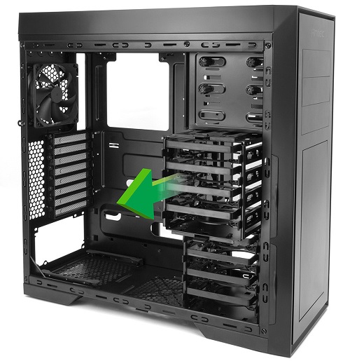 Antes P9 Window is made in the form factor Mid-Tower and has dimensions of 210 x 465 x 470 mm.  The case accommodates motherboards sizes of Mini-ITX, Micro-ATX and ATX.  New device features two removable baskets for 2.5- / 3.5-inch drives, each of which is placed on the four storage devices.  Also, two brackets for 2.5-inch drives available on the reverse side of the wall for mounting the motherboard, and the baskets were placed on three 5.25-inch bays.