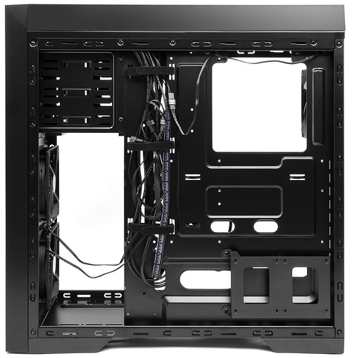 The case is designed for graphics cards up to 430 mm.  The number of expansion slots in P9 Window Antes case is eight.  Also, removing the basket for storage is possible to be mounted on the front wall of 240mm radiator liquid cooling system.  More a place in the 280- / 360-mm radiator is available on the top panel.  Note also that the body has a hole for attaching the liquid CO tank (again, instead of baskets for HDD).