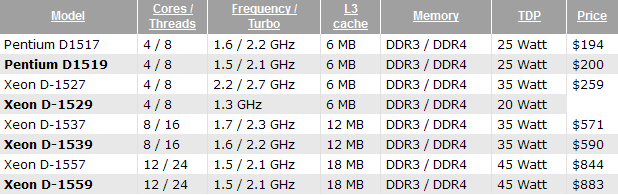 In the first quarter  2016, Intel added a line of processors Xeon D and Pentium D models on the new generation of computing cores Broadwell-DE.  This single-chip solution for microserver and communication equipment with a very high efficiency, because the list of models present SoC with 12 and even 16-core "class" Xeon.  In April, according to CPU-World website, a list of the embedded server processors Intel added models D1519, D-1529, D-1539 and D-1559 with the number of cores from 4 to 12 pieces.  And all models of D-15x9 are designed to operate in extreme environments at temperatures from -40 to +80 degrees Celsius.