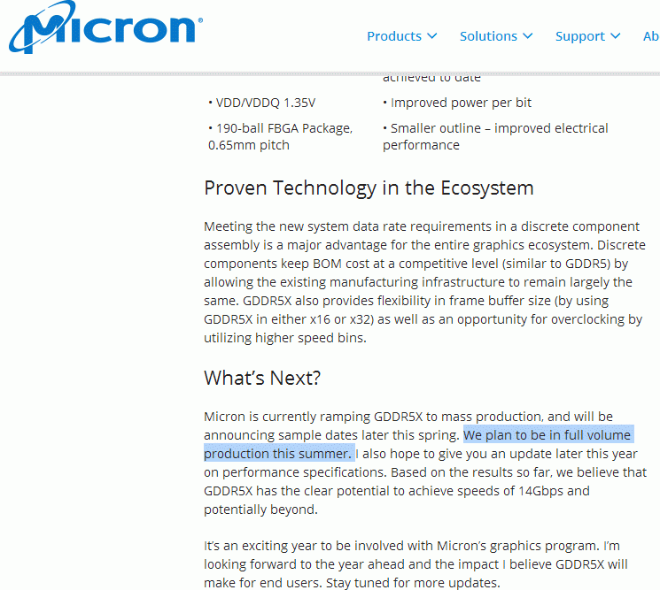 While all gamers look forward to meeting with the GeForce GTX 1080 review which we will see in eight days, Bits & Chips Italian colleagues gives a series of questions related to innovation, and one of them is the availability of GDDR5X memory types in sufficient quantities for the mass production of GeForce GTX 1080. NVIDIA Head at the presentation repeatedly emphasized that Micron will supply GeForce GTX 1080 memory chips type GDDR5X, which in this specification will operate at a frequency of 10 GHz QDR.