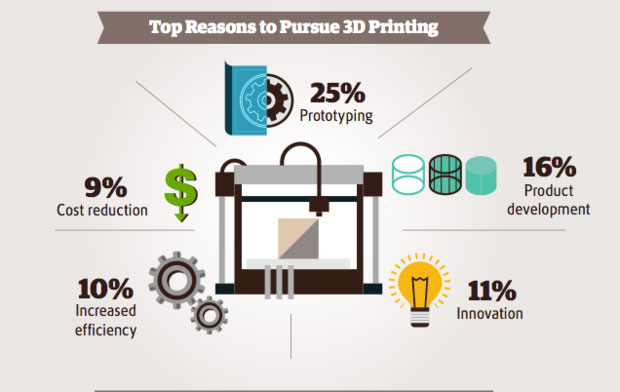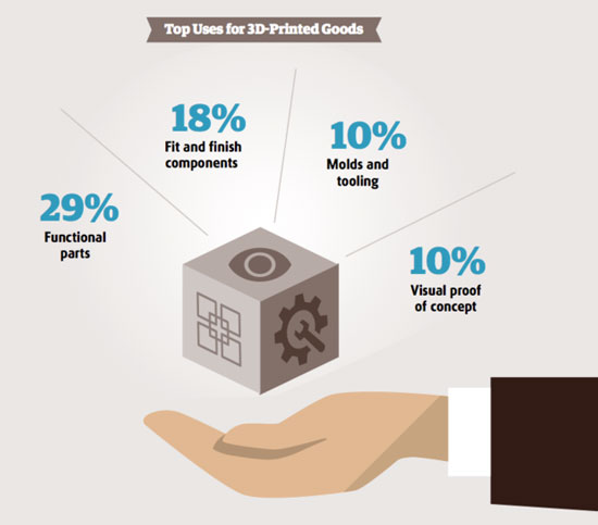 3D printing is already used about two-thirds of the producers and 25% plan to start it in the future. The main objectives for the 3D printing manufacturers consider prototyping (25%), product development (16%) and innovation (11%). In the early adaptation of 3D printing main task was to create a prototype. In fact, 3D printers are now held only 0.04% of world production. Over time, this niche promises to take up to 5% of the global production market, which means fabulous profits at the level of $ 640 billion Annually.
