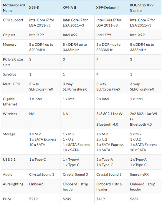 In anticipation of the processors Intel Broadwell-E Asus company prepares to release four new motherboards based on Intel X99 for the CPU socket LGA 2011-3.  The top four includes the following new items: ROG Strix X99 Gaming, X99-Deluxe II Signature, X99 A-II Signature and X99 E.