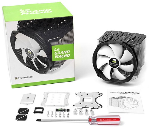 Cooling System Le Grand Macho RT is able to take up to 280 watts of heat. Â Novelty has an asymmetrical design, ie, it will not interfere with either the RAM or expansion card in the PCI-e slots. Â Dimensions of the cooling system are 152 x 147 x 159 mm, and it weighs 1060 design includes seven 6-mm nickel-plated copper heat pipes that pass through the nickel-plated copper base and a large aluminum heatsink.