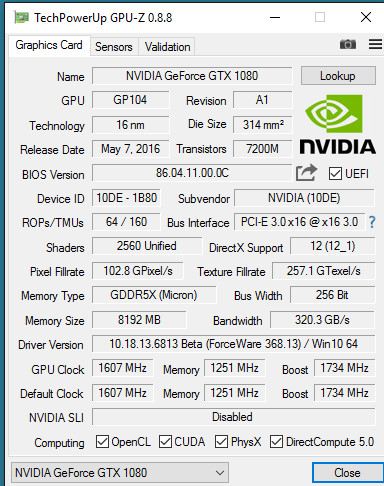 Just note that the GPU-Z utility has been updated to version 0.8.8, which has added full support for GeForce GTX 1080 . The most interesting information that can be obtained from the screenshot - is the number of sample units of textures and raster operations units, which the novelty of 160 and 64 pieces, respectively.