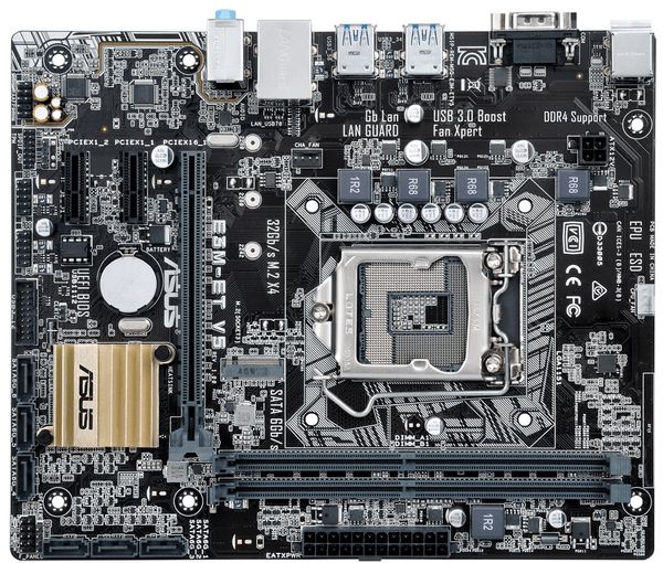 ASUS E3M-ET V5 allows the installation of up to two modules DDR4 up to 16 GB each equipped with a single slot PCI-Express x16 slots and two PCI-Express x1, a seat for installing SSD-drive form factor M.2 NGFF (supported like SATA, so and PCI-E), six SATA3 connectors, audio section based on the Realtek ALC887 controller (there was a place on the liquid electrolyte capacitors and isolation from the rest of audio section of the board) and Gigabit LAN controller Realtek RTL8111H.