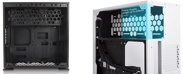The power supply is mounted sideways in the upper part of the body, and can accommodate up to three 120-mm fans or radiator liquid cooling system size 120, 240 or 360 mm. Another 120-mm fan or heat sink can be fixed on the rear wall of the case In Win 303. The bottom panel can be mounted up to three 120-mm fans. Ventilation holes on the bottom panel fitted with a particle filter.