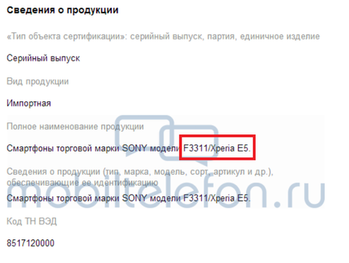 In the published document it states that under the model number disappears Sony F3311 Xperia E5.  Previously, , along with Sony F3216 was seen in the benchmark GFXBench, saying that it is equipped with 4.6-inch touchscreen display with a resolution of 1280 x 720 pixels, a single-chip platform MediaTek 6735, 1.5 GB of RAM and two cameras: a 16-megapixel main and 5 megapixel front.