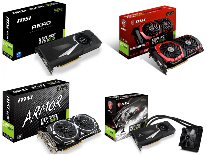 Let's start with the MSI company, which presented immediately six options  GeForce GTX 1080. In its press release, MSI has said the use of the power system with 12 phase (probably not all new products), and the two power connectors - 8- and 6-pin .  In line MSI innovations included: GTX 1080 Gaming X 8G with renewed cooling system Twin Frozr VI with LED RGB-backlit, GTX 1080 Sea Hawk with a liquid cooling system from Corsair, GTX 1080 Armor 8G and Armor 8G OC cooling system Armor 2X, which  reminds Twin Frozr V, and 1080 GTX graphics card Aero 8G and Aero 8G OC, the cooling system which is very similar to the reference.