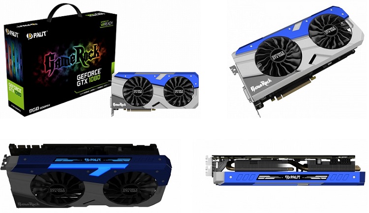 Palit Company  produced  graphics cards  in   GeForce GTX GameRock 1080 and GeForce GTX 1080 Super JetStream.  New items are equipped with similar cooling systems with two 100-mm fans which are switched off at  low load.  Palit Graphics cards received power system with eight phases, and are equipped with 8- and 6-pin connectors for connection to the power supply.  The operating frequencies are also unknown.  According to VideoCardz , basic GPU frequency of the model GameRock equal to 1645 MHz, and operates at a frequency of 1708/1847 MHz in the Super JetStream GPU.