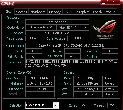 We have already seen a pair of 22-core Xeon E5-2696 v4 using water blocks overclocked to 3670 MHz , but the next experiments was the achievement of Indian opponent. A couple of Broadwell-EP processors with 22 physical cores American was overclocked to 3858 MHz.