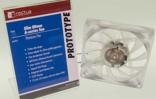 More Noctua fans expanded its A-series (A-series), which differ in thickness of 15 mm.  Some new transparent diameter fans 50, 60, 70 and 80 mm.  All new items are supplied with a 20 mm adapter, which allows you to expand the scope of their application.  Fans A-series, as well as the above-described thin 120-mm fan, equipped with rubber pads to reduce noise level and are based on double-row ball bearings.  New items are available with PWM versions and without, as well as for power versions of 12 and 5 V.