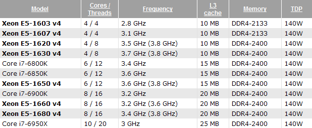 Model E5-1603 v4 and E5-1607 v4 - is the youngest quad-core solutions without support Hyper-Threading.  They operate at frequencies respectively, 2.8 GHz and 3.3 GHz.  Each of them has 10 MB L3 cache and memory controller that supports DDR4-2133 modules.