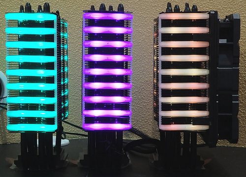 This is not the first CPU cooler with LED RGB-backlit, but manufacturer has placed the backlight on the two sides of an aluminum radiator with plastic linings. Also highlighting Lepa is logo on the top plate of the radiator. Included with the refrigeration system NEOllusion supplied remote control, with which you can control the color, brightness and backlight mode.