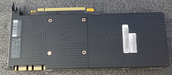 On the reverse side of the PCB is provided reinforcing plate. In general, GeForce GTX 1070 reference design is very similar to older 1080.