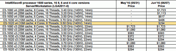 Xeon E5-1620 v4 quad-core Broadwell-E alternative for 294 dollars (2016-06-10)