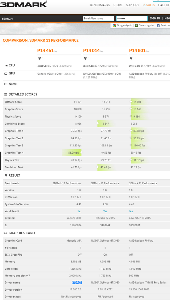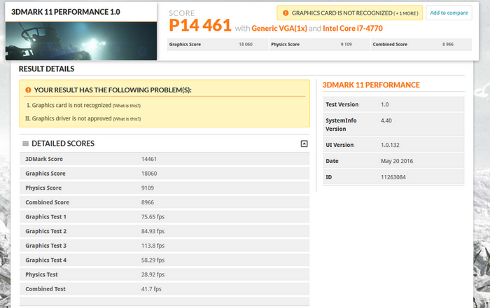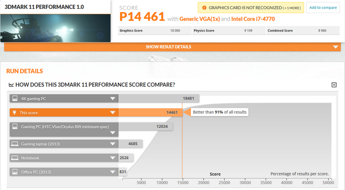 Testing was conducted on a system with a processor Intel Core i7-4770 with regular frequency. This configuration scored 14,461 points in Perfomance test, which is more than 2000 points more than the minimum needed for acceptable performance for VR-set. Also note that this result is between the results of the GeForce GTX 980 and Radeon Fury.