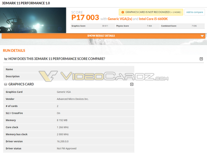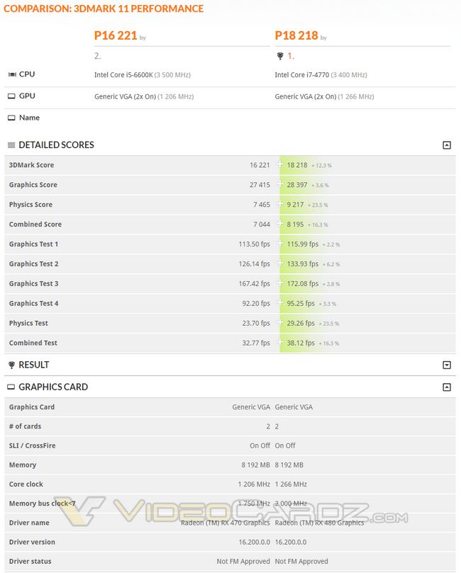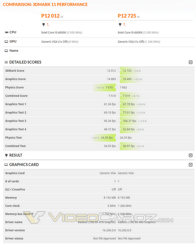 As for the Radeon RX 470, also known as 67DF: C4, in the 3DMark 11 Performance this card gains about 13100 to 16164 points (Graphics Score). As VideoCardz states, the average score is 13368. For comparison, according to the calculations of our colleagues, the average score Radeon RX 480 is 16823.