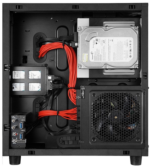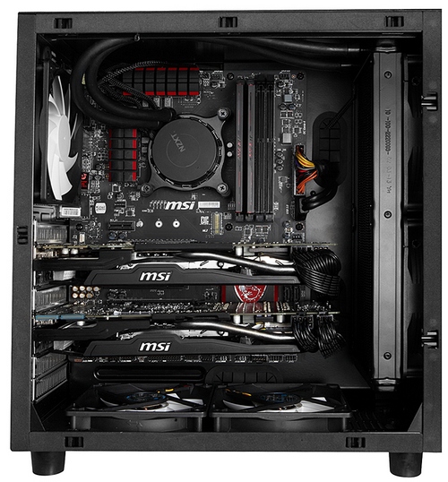It comes with two 140-mm fans pre-installed on the front panel, and one 120-mm on the rear.  Additionally, the user can add one 80-mm fan on the front panel, and two 120 mm fans on the bottom.  It is also possible to install liquid cooling system with two radiators up to size 280 mm, which can be mounted on the front and bottom panels.