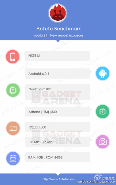 Thus, according to AnTuTu smartphone Nubia Z11 will receive a display with a resolution of 1920 x 1080 pixels, and will be based on a single platform Snapdragon 820, which will add 4 GB of RAM. Built-in memory will be equal to 64 GB. Also, the smartphone is equipped with a 16-megapixel rear and 8-megapixel front cameras. New products will run on Android 6.0 Marshma Thus, according to AnTuTu smartphone Nubia Z11 will receive a display with a resolution of 1920 x 1080 pixels, and will be based on a single platform Snapdragon 820, which will add 4 GB of RAM. Built-in memory will be equal to 64 GB. Also, the smartphone is equipped with a 16-megapixel rear and 8-megapixel front cameras. New products will run on Android 6.0 Marshmallow. llow.