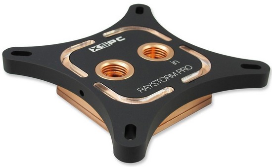XSPC positions RayStorm Pro as the most efficient water-block from ever produced by the company.  And the base of the water block, and its cover is made of copper, which according to the manufacturer increases the cooling efficiency.  The water block has tapped holes G1 / 4 ". Fixing frame waterblock is made of black aluminum and has an insert made of acrylic, and it has two holes, intended for mounting 3mm LEDs for illumination. RayStorm Pro is only compatible with the processor socket LGA 115x, LGA 1366 and LGA 2011 (-3).