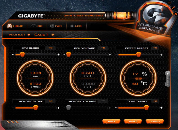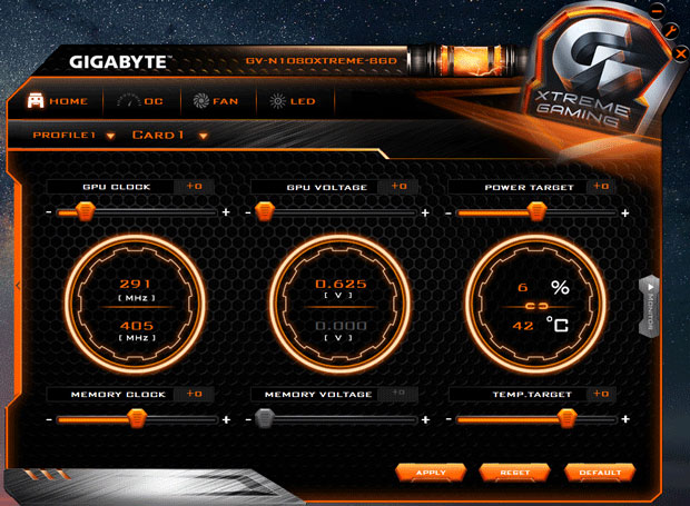 The test system used  the graphics card Gigabyte GeForce GTX 1080 Xtreme Gaming.  adapter parameters were monitored using Gigabyte Xtreme Gaming Engine utility.  The two ports DisplayPorts adapter connects monitors Eizo Foris FS2735 with support for 144 Hz FreeSync and Asus ROG Swift PG279Q with support for 165 Hz G-Sync.  When connecting the first one monitor Asus ROG Swift PG279Q idle system video frequency was 291 MHz, regardless of the monitor mounted on the frame rate of 60 Hz or 165 Hz.  Measurement system via consumption Watts Up showed an average of 65-75 watts.