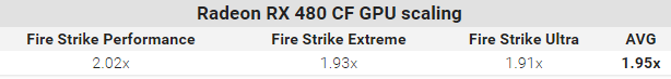 The table above shows the results of tests of standard versions  Radeon RX 480 in various 3DMark benchmarks.  "Average" column includes the average results for each test scored graphics with overclock and without.  "Median" column includes the average number of points scored in each test video cards with standard frequencies.  Finally, the column "Maximum" contains the maximum values scored Radeon RX 480. Also in the right part of the table shows CrossFire results combination of the two cards.