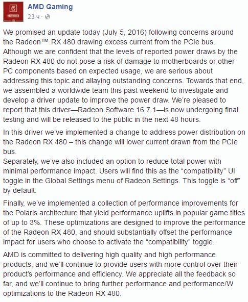 AMD has tried to quickly respond to the accusations of excessive energy of video cards Radeon RX 480. By the way, in a statement the new AMD representatives continue to maintain that all the experienced slot PCI Express motherboard power loads remain within the normal range.