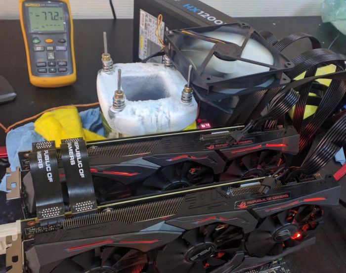 This week a group of Russian enthusiasts (_12_, Smoke and slamms) took third place in 3DMark05 among all pairs of cards with 82 869 points. Video cards were overclocked to 2113/10400 MHz without the cooling system modification, the CPU Core i7-6700K with liquid nitrogen reached the frequency 6579 MHz.