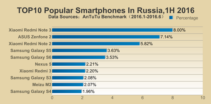 And in Russia the most popular smartphone in the first half was the Xiaomi Redmi Note 3. In second place is Asus Zenfone 2, and closes the top three Xiaomi Redmi Note 2. The top ten most popular smartphones in Russia according to AnTuTu entered and four smartphone Samsung: Galaxy S5 It got the fourth place, Galaxy S6 - fifth, Galaxy S3 - eight, and Galaxy S4 - the tenth. Also, the rating includes Nexus 5, Xiaomi Redmi 3 and Meizu M2. Related Products :