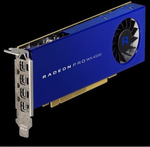 Radeon Pro WX 4100 based on the graphic processor Polaris 11 (Baffin) will please not only the low-profile performance, but at the cost of not more than $ 500.  The decision received 1024 stream processors and 128-bit bus, which connects the graphics processor with 4 GB of GDDR5 memory type, operating at a frequency of 7 GHz QDR.  The performance level at the level of 2 teraflops prevents illusions.  TDP value does not exceed 75 watts, which allows the video card to work without additional power connector.  On the rear panel are located four outputs mini-DisplayPort, which can simultaneously work with four monitors.