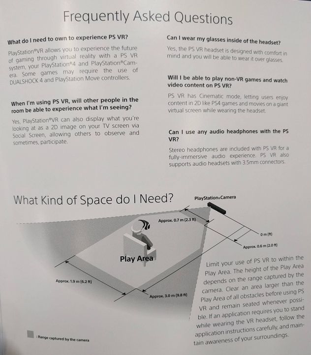 PlayStation VR allows the player to wear glasses for sound reproduction will fit any headphones with a standard plug size 3.5 "Minimum distance at which you can approach the camera -. 0.6 meters The angle camera coverage -. 60 degrees, so the user must be at a certain distance from it. the dimensions of "playground" is defined by the formula "1.9 x 3.0 meters." When working with a virtual reality helmet is recommended that the user to remain in a sitting position. When switching to a vertical position must be careful.