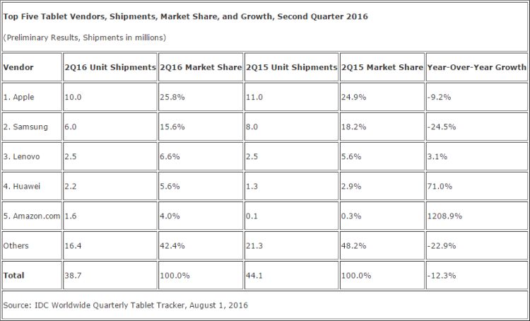 Second place goes to the Samsung company, but the growth in demand for the brand tablets is not the most encouraging - a fall of 24.5% may cause the Korean manufacturer to consider the release of the tablet with a detachable keyboard unit.  Ranked fourth Huawei, by the way, much success in the market of convertible devices is not achieved.  A holding third place Lenovo also not losing ground mainly due to the popularity of its classic tablet available, rather than innovative devices more expensive class.  Amazon at the expense of sales of cheap compact tablet retains fifth place.