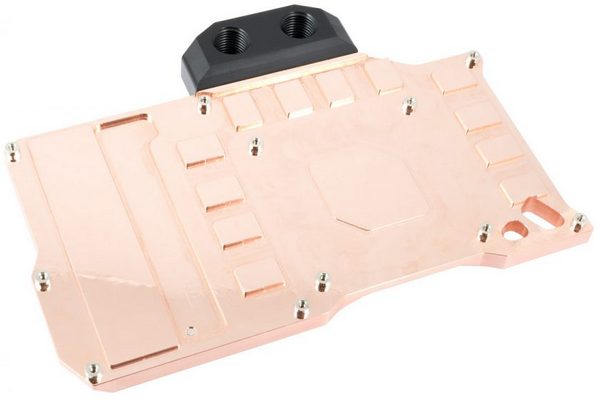 Ground water block Kryographics Pascal for NVIDIA Titan X is made of copper and has a thickness of 10 mm, and in any case a full coating with a water-block, the base is contacted not only with the graphics processor, and memory chips, and power subsystem components.  The manufacturer notes that the water block is designed to use thermal grease, not only on the graphics processor, but also on the memory chips, which provides better heat transfer.  But for transferring heat from the power subsystem uses thermal pads.