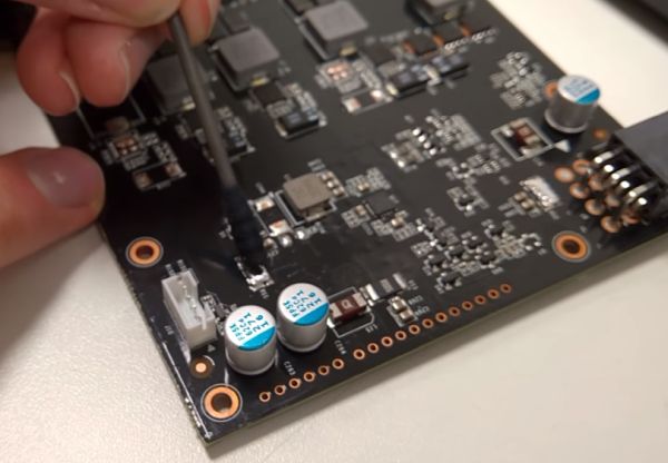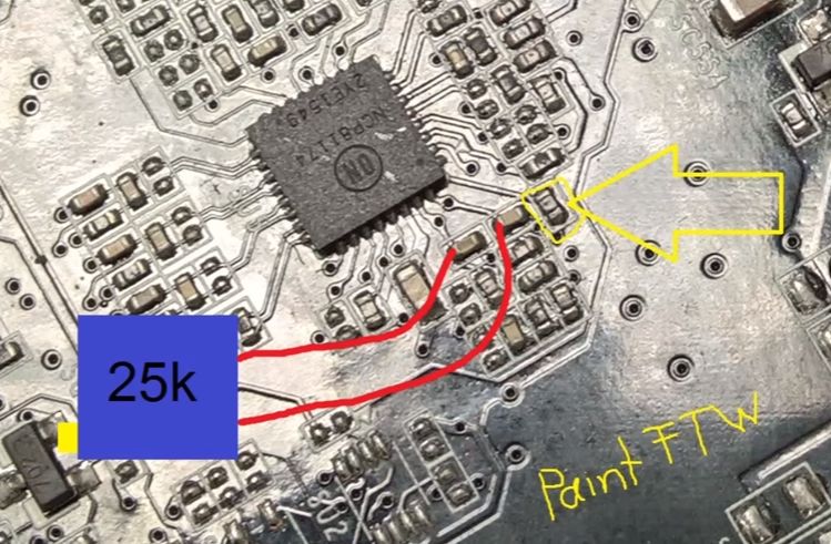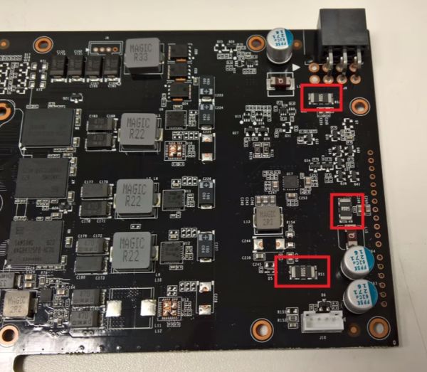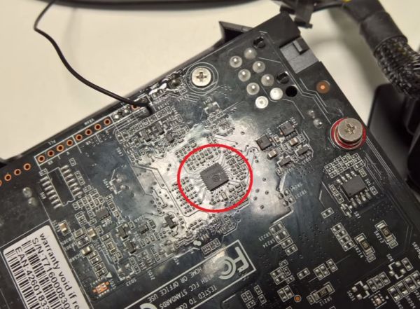 on the reverse side of the PCB has been soldered trimmer, who has participated in the management of the GPU voltage.