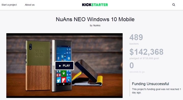 At Kickstarter platform was launched a campaign to raise funds for the global launch of the new smartphone NuAns NEO on Windows 10, which back in January was represented by Nuans for the Japanese market. Until August 9, the company planned to raise $ 725,000, but, alas, to achieve this goal it failed.