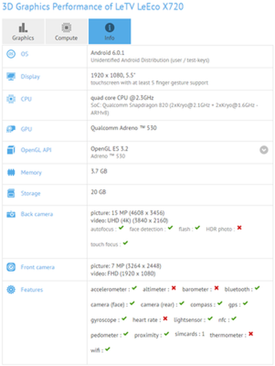 According to GFXBench, smartphone LeEco Le 2S with model number LeEco X720 is equipped with quad-core Qualcomm Snapdragon processor 820 with graphics Adremo 530 and 4 GB of RAM. It will be based on the latest Qualcomm Snapdragon 821 chip and become the world's first smartphone with 8 GB of RAM.