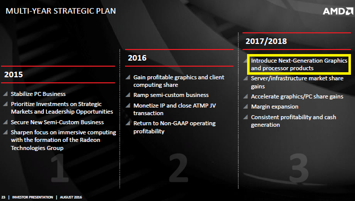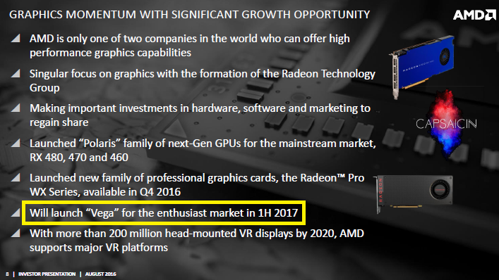 Actually, the main news is a further confirmation of the immutability of AMD intentions to present graphical solutions generation Vega in the next year. Well, we at least can rejoice in the fact that it will happen in the first half of 2017. For example, on a slide for the second half promised some Vega-generation products for enthusiast. In fact, Vega is needed primarily AMD's new flagship. Accordingly, you should not expect that AMD will introduce Vega graphics solutions more affordable class this year. We can only hope that the premier model Vega in the next six months will be equipped with memory of type HBM2.