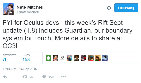 Vice-president of Oculus company products   - Nate Mitchell  said that the September update software Rift SDK package (version 1.8) will be the realization of Guardian system - an electronic platform layout, within which the player can move the helmet Oculus Rift.