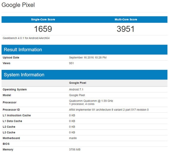 Two weeks later, Google will reveal the world their new smartphones Pixel and Pixel XL , developed in collaboration with HTC Corporation. And shortly before the debut Pixel XL, which had previously appeared in the media, code-named Marlin, passed the test in the benchmark Geekbench. Its result - 1659 points in the single core test and 3951 points in multi-core mode.