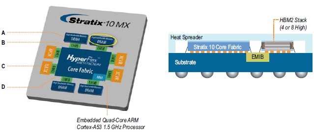 Four cores with ARM Cortex-A53 architecture coexist with a certain amount of memory type HBM2, all programmable matrix comprises 5.5 million. Logical elements.  HBM2 type memory may in this case contain four or eight "layers", it is capable of transmitting TB to 1 / sec.
