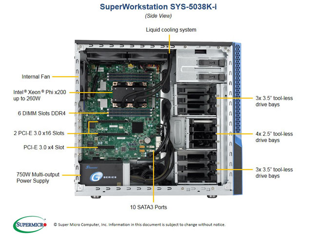 The processor is supported by the chipset Intel C612. The board can be detected two ports of 1 Gbit / s Ethernet, 10 ports SATA 6Gb / s port 1 VGA, 1 COM port, five USB 3.0 ports and 1 USB 2.0 port. Judging by the description of the server, CPU cooling is engaged in maintenance-free liquid cooling system with dissipation up to 260 watts. Full specs Supermicro K1SPE board can be found at this page on the company website.