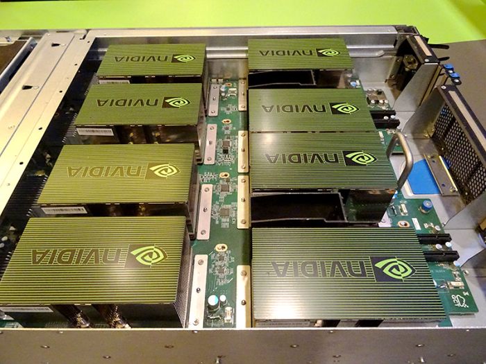 At the height of the ribs NVIDIA passive radiators in this case do not skimp. Each accelerator is able to consume up to 300 watts, so the more massive radiators and blown regular fans located in the server module case.