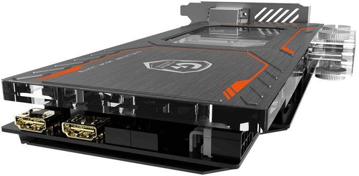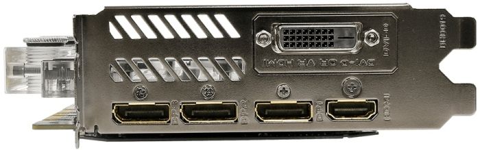 On the back of the video we see the usual array of ports, one DVI-D, one HDMI, and three DisplayPort. Another two HDMI ports facing inside the system unit.
