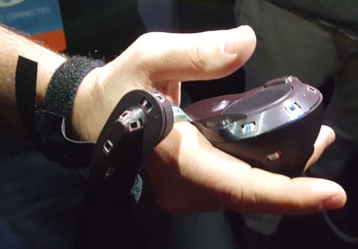 The new version of manipulators smaller, but important innovation - a fixture that allows the manipulator to be within reach when fully decompressed fingers.  The manipulator is built 21 sensors, some of which tracks the movement of the fingers.