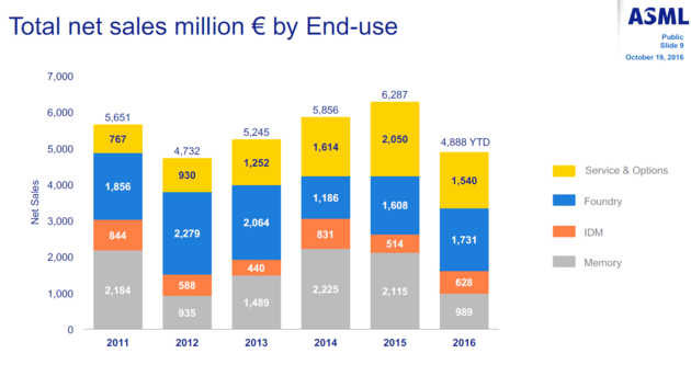 In the picture above you can see a chart of ASML revenues depending on the category of products sold (only the data for the three quarters ended in 2016).  As the schedule, sales of photolithography equipment for the production of semiconductors contract growing for the second year in a row.  But the equipment for the memory issue has come to enjoy less demand than the last three years.