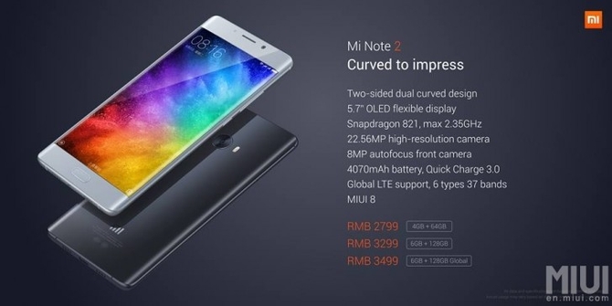 Xiaomi Mi Note 2 is curved OLED-display, which occupies 77.2% frontal surface against 67.7% of the iPhone 7 Plus. Its resolution is 1920 x 1080 pixels (Full HD). The base of novelty lay quad-core Qualcomm Snapdragon 821 chip with a clock speed of 2.35 GHz, complete with 4 or 6 GB of RAM type LPDDR4. Also, the smartphone is equipped with a 22.56-megapixel rear camera with Sony IMX318 sensor system of electronic image stabilization and dual LED-flash and 8-megapixel front-facing camera with a Sony IMX268 sensor and a lens with an aperture f / 2.0. It has an ultrasonic fingerprint scanner and endowed support for NFC, Wi-Fi, Bluetooth, LTE and GPS accuracy.
