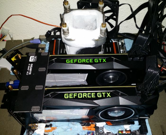 Filipino enthusiast dhenzjhen combined the processor CPU Core i7-6950X with a pair of NVIDIA cards Titan X (Pascal) last week, equipped with standard air cooling system. Core i7-9650X overclocked to 5.1 GHz using liquid nitrogen, and NVIDIA Titan X graphics card in the normal state overclocked to 2050/10800 MHz. In The test Catzilla 720p the system scored 102,050 points , at the same time taking the third place in the absolute classification.