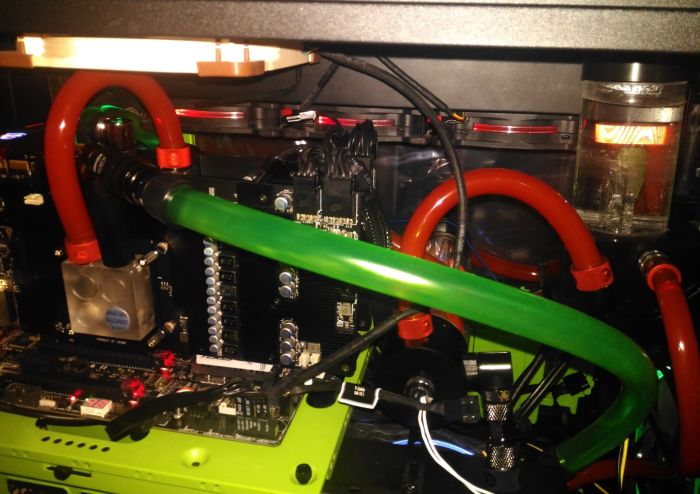 A pair of graphics cards GeForce GTX 1070 overclocked to 2063/9102 MHz, while retaining their native air cooling system. The CPU Core i7-5960X overclocked using water block, frequencies above 5.0 GHz.