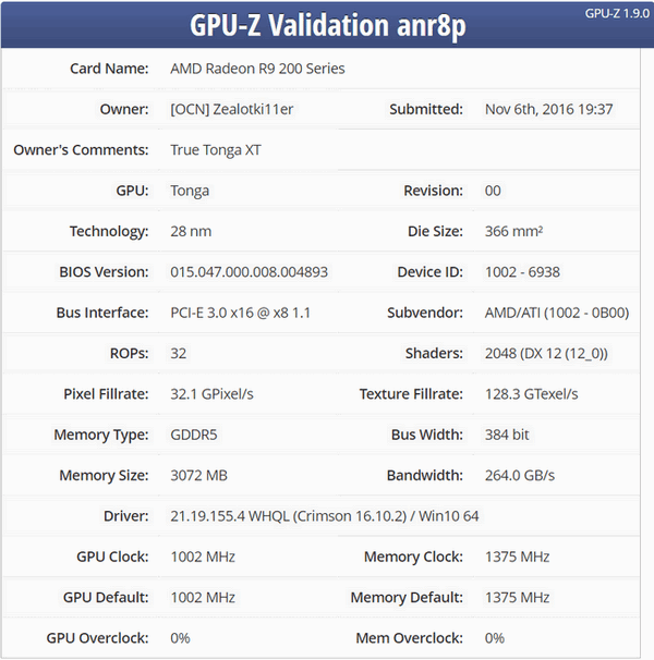 Also GPU-Z data confirm that the full graphics processor Tonga stream processor 2048 initially had 384-bit bus, but this configuration, it was not released.  In late 2014 graphics processor Tonga with 2048 stream processors, but with a 256-bit bus only appeared in video card Radeon R9 M295X composed iMac.