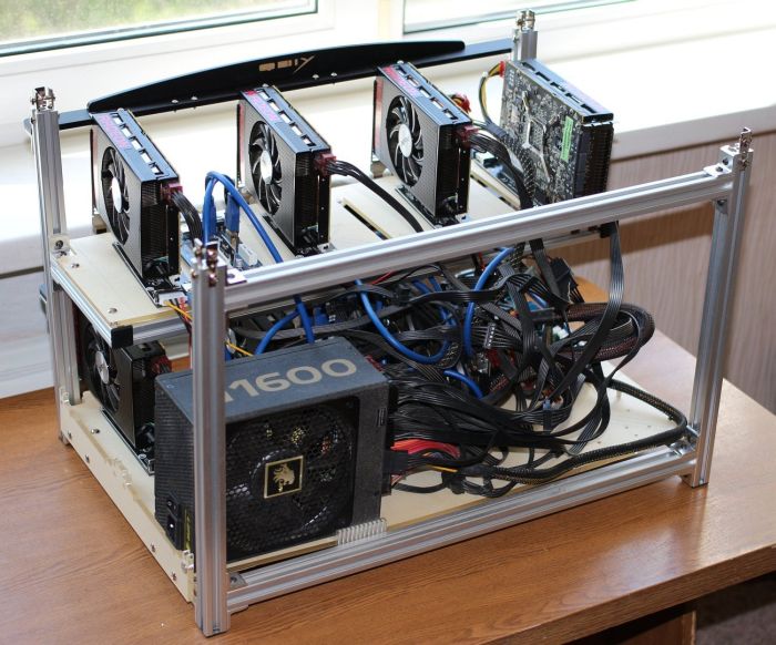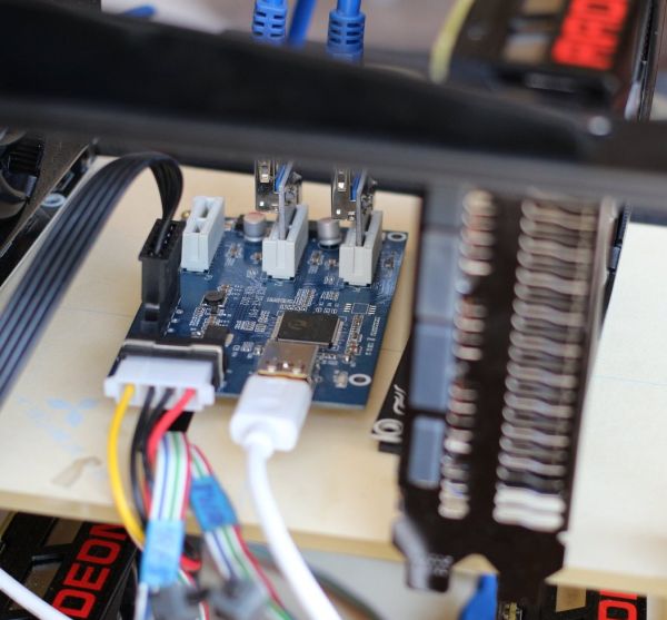 Seven cards with the standard cooling system coexist in the same system with the help of smart adapters and adapters.  The absence of a rigid mechanical connection between the graphics card allows them to be placed freely on the shelf, while maintaining sufficient for efficient cooling side of the interval.